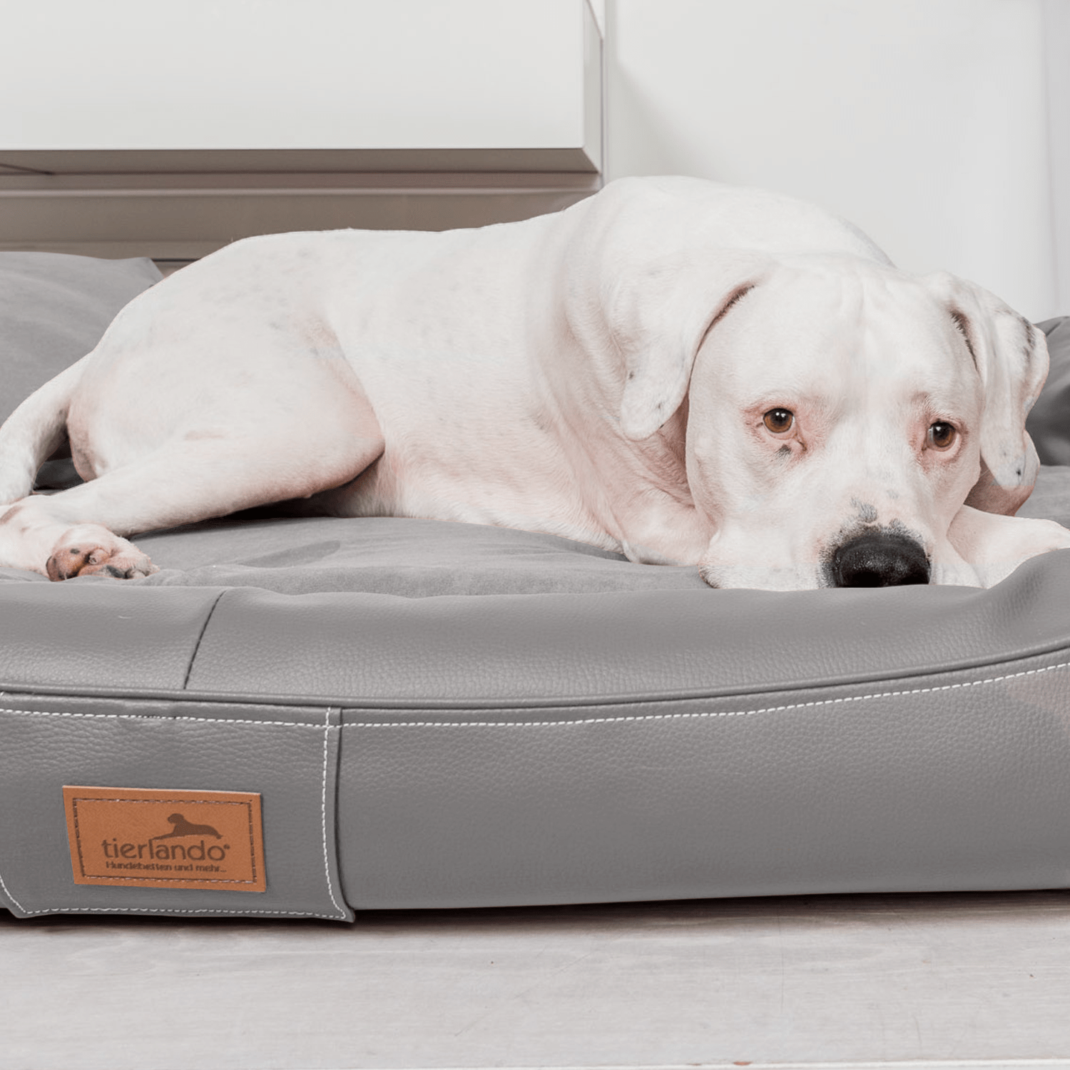 ORTHO PLUS mit High-Tech-Viscoschaum in der mobilen 2-Schicht-Matratze. Bezug aus pflegeleichtem, gegen Haar und Gerüche resistentem Kunstleder und super weichem Velours. Eine klare aber durchaus kühne Designsprache, verbunden mit maximaler orthopädischer Qualität gewährt Ihnen und Ihrem Schatz ein Höchstmaß an Komfort und Alltagstauglichkeit. Absolute Premium-Klasse! Diese humanmedizinisch bewährte Materialwahl eignet sich für Hunde, die von Risiken oder Schäden an Knochen, Gelenken oder Wirbelsäule betroffen sind. Für alle anderen Hunde ist es purer Liegeluxus auf Wolke 7. Das spezielle Material lässt aufliegende Druckpunkte quasi schweben und fördert die maximale Durchblutung in jeder Lage.